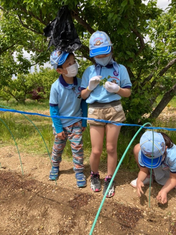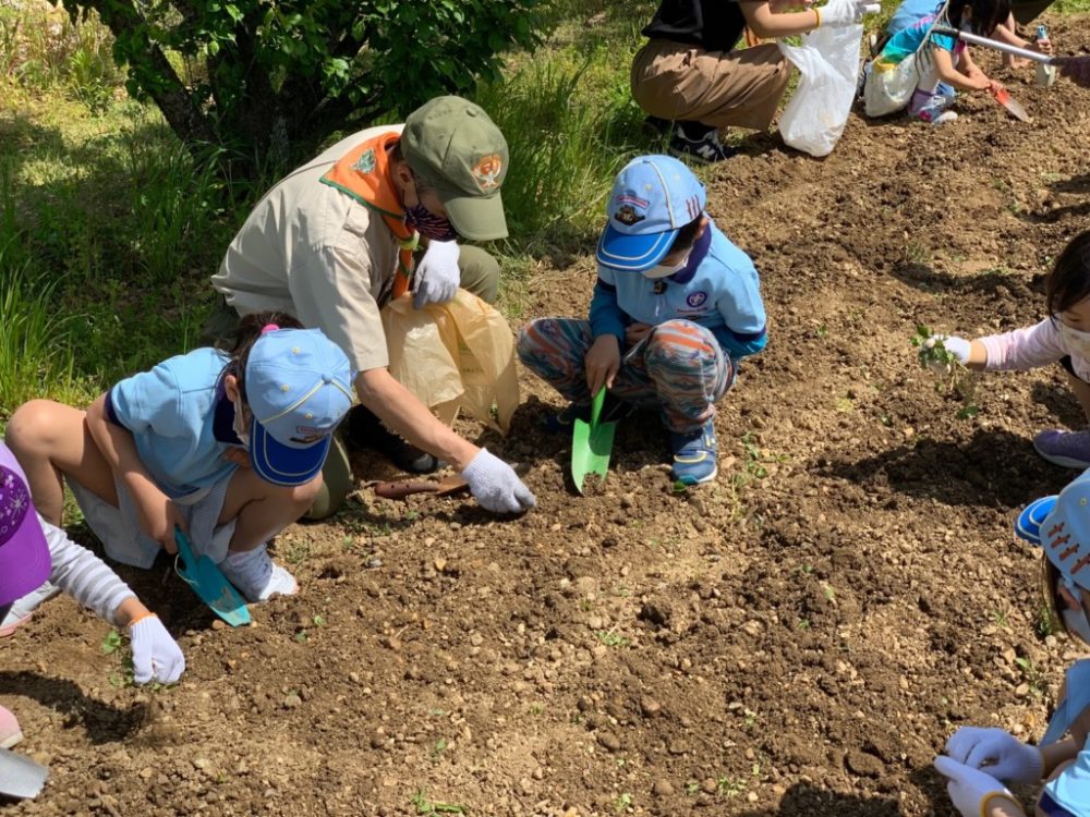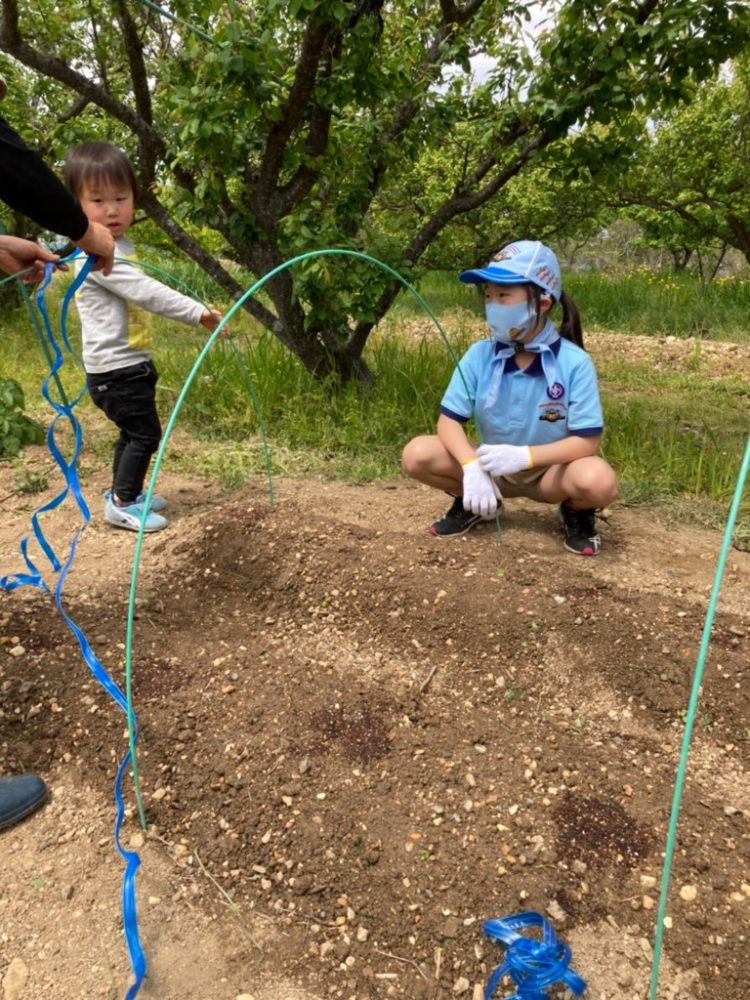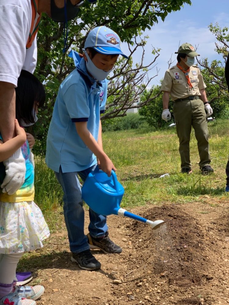 今日は落花生の種を畑にまきました。はじめにベンチャースカウトのお兄さんがゲームをしてくれました。それから畑の石や草を取ってたねをまいて水をあげました。クロアゲハが飛んでいたり、てんとう虫が卵を産んでいたり、図鑑で見た通りだったのでうれしくなりました。