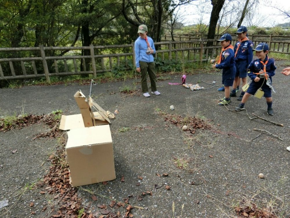 カブ隊はビーバー隊と一緒に、スタンプラリーへ。収穫祭に現れたみよし仙人から「食べ物への感謝を感じながら行こう!」と教えられ、スタート! 三好丘四ッ池の周辺を巡りました。的入れゲームは、ビーバー隊の子達にも楽しんでもらえるよう、自分達で作った的を使ってもらいました。組ごとに形も装飾も違って、組の色が出ていました。遊び歌を楽しんだり、ボーイ隊のロープ技で宙に浮いたりしながらゴールへ向かい、最後はどんぐりでやじろべえとコマを作りました。やじろべえのバランスにこだわったり、けんかゴマで競ったり、とても楽しく遊びました。