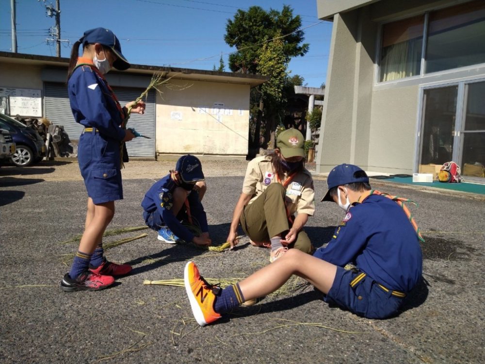 今回は少し早いですが、しめ縄作りをしました。団委員さんが用意してくれた青い藁を使って、隊長の指導のもと、みんな頑張りました。