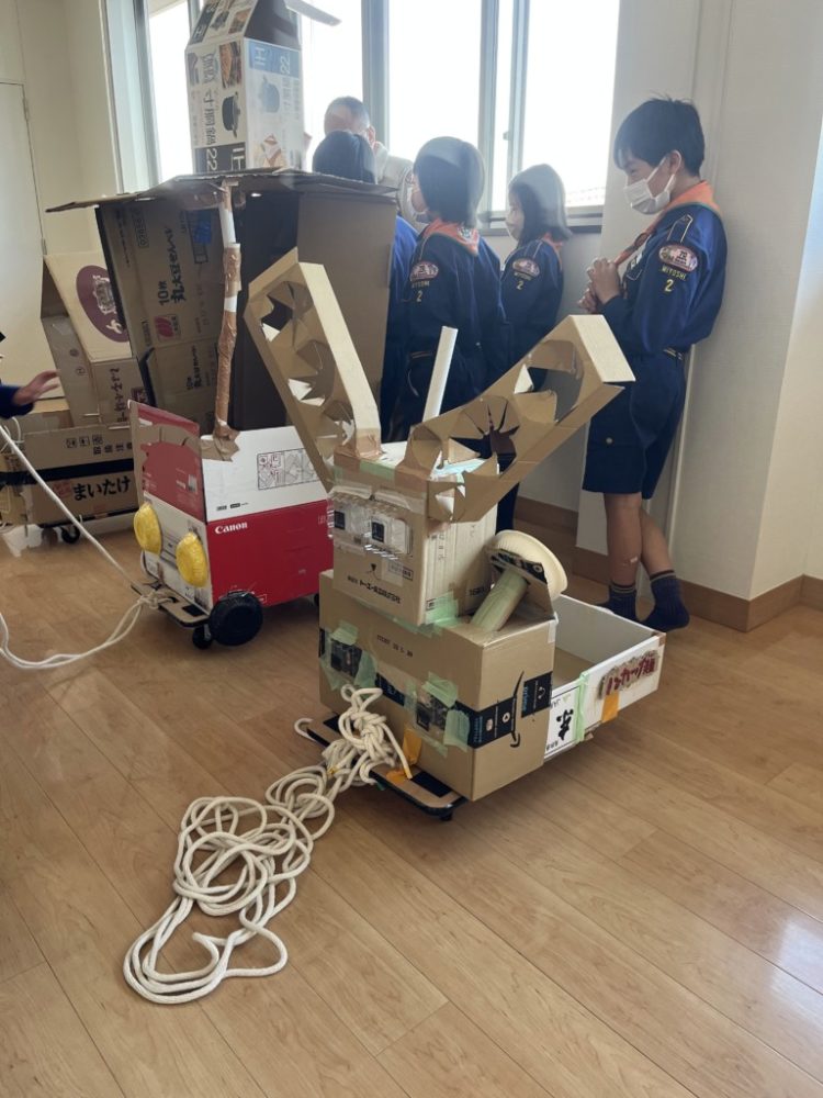 各組で工夫をこらしたデザインを考え、段ボール、プラスチック容器などで素敵なクラフトカーを作成しました。