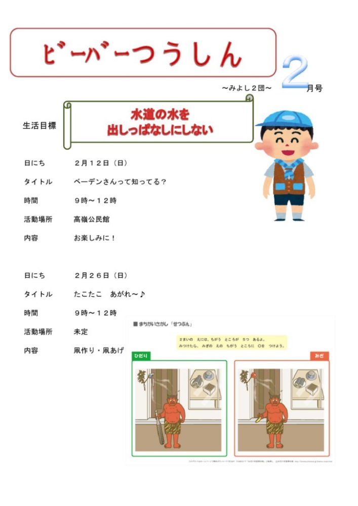 2017年1月29日 / 最終更新日時 : 2017年1月29日 みよし2団 ビーバー隊 ◆ビーバーつうしん2月号 ビーバー通信2月号です。 生活目標:水道の水を出しっぱなしにしない! 2月は凧揚げをします。お楽しみに! ビーバー通信2月号.pdf FacebookXBluesky